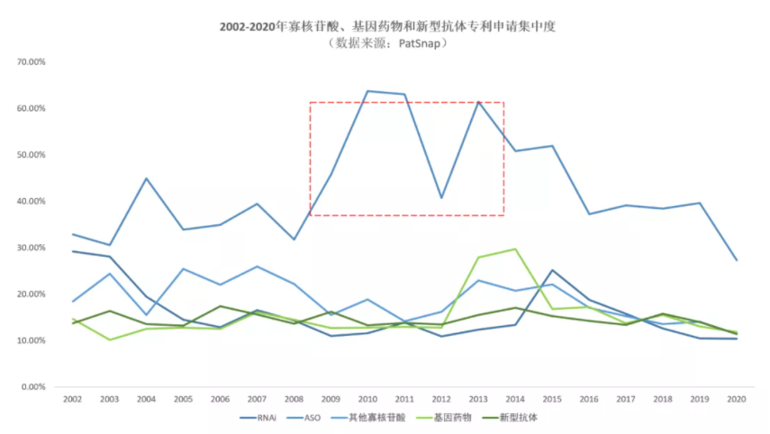在学术界对于ASO的基础研究热情日益高涨、不断为ASO注入新的技术研究的背景下,ASO领域现有的技术布局集中度如何?为了对ASO领域的技术布局集中度有所了解,我们对寡核苷酸的三个细分领域进行了专利申请量统计,经分析发现,ASO领域的专利申请集中度要远大于其他两个寡核苷酸类别以及两个热门的对标领域(基因药物、新型抗体)。从前十大专利申请实体的专利数占年专利总数的百分比来看,ASO领域显著高于其他四个领域,头部效应明显。