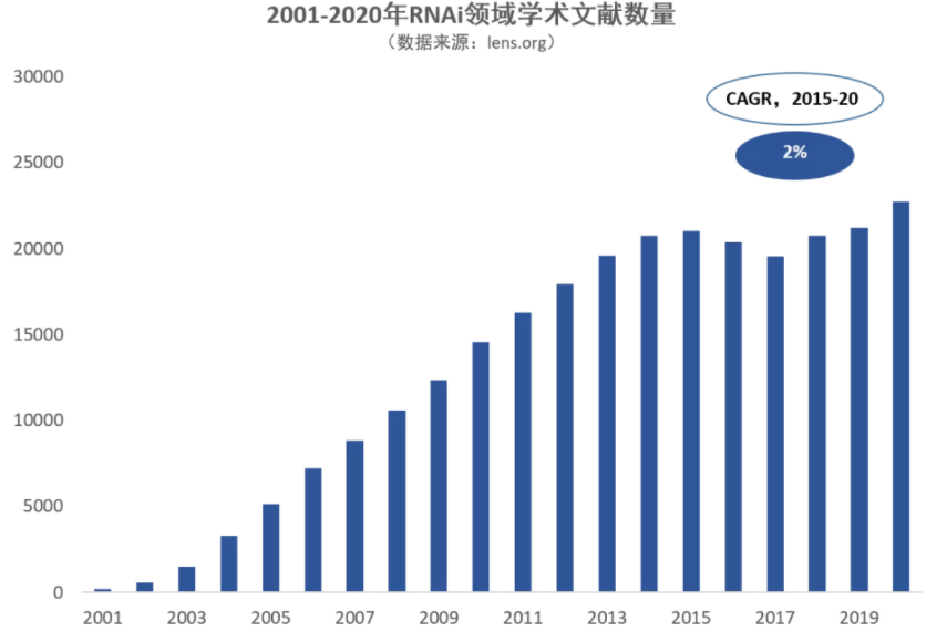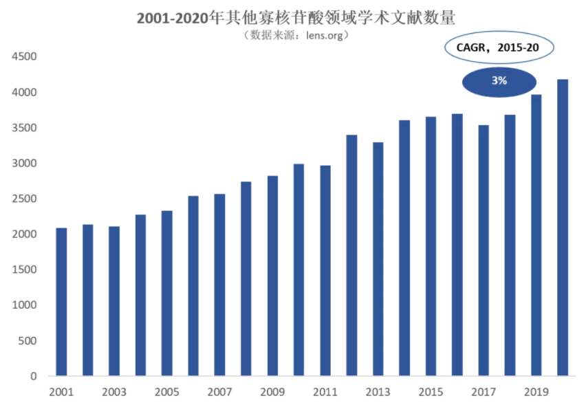 通过对这三个寡核苷酸细分领域的学术文献数量进行分析,我们发现,ASO领域的学术文献数量在2015年至2020年间年复合增长率(CAGR)最高,达10%,显示了学术界对于ASO领域的研究热情日益高涨,其余两个领域,RNAi和其他寡核苷酸CAGR分别为2%、3%,学术文献数量增长较平稳。