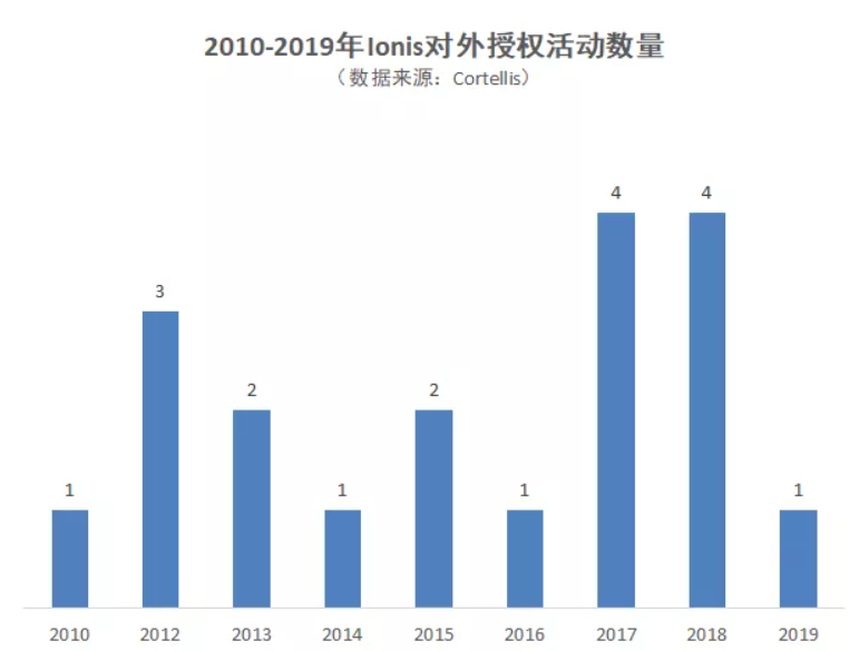 Ionis在2010年后加速专利布局,在完成技术专利布局后近年授权活动频繁,2010年至今的向外授权活动数量有19起。例如2019年将IONIS-MAPTRx,一种旨在选择性减少微管相关Tau蛋白(MAPT)产生的反义疗法,授权给其神经疾病合作伙伴安进(Biogen),MAPT已被证实与多种神经退行性疾病的发生有关。两家公司在已经成功上市的治疗脊髓性肌萎缩症的药物Spinraza的商业化过程中也有合作。